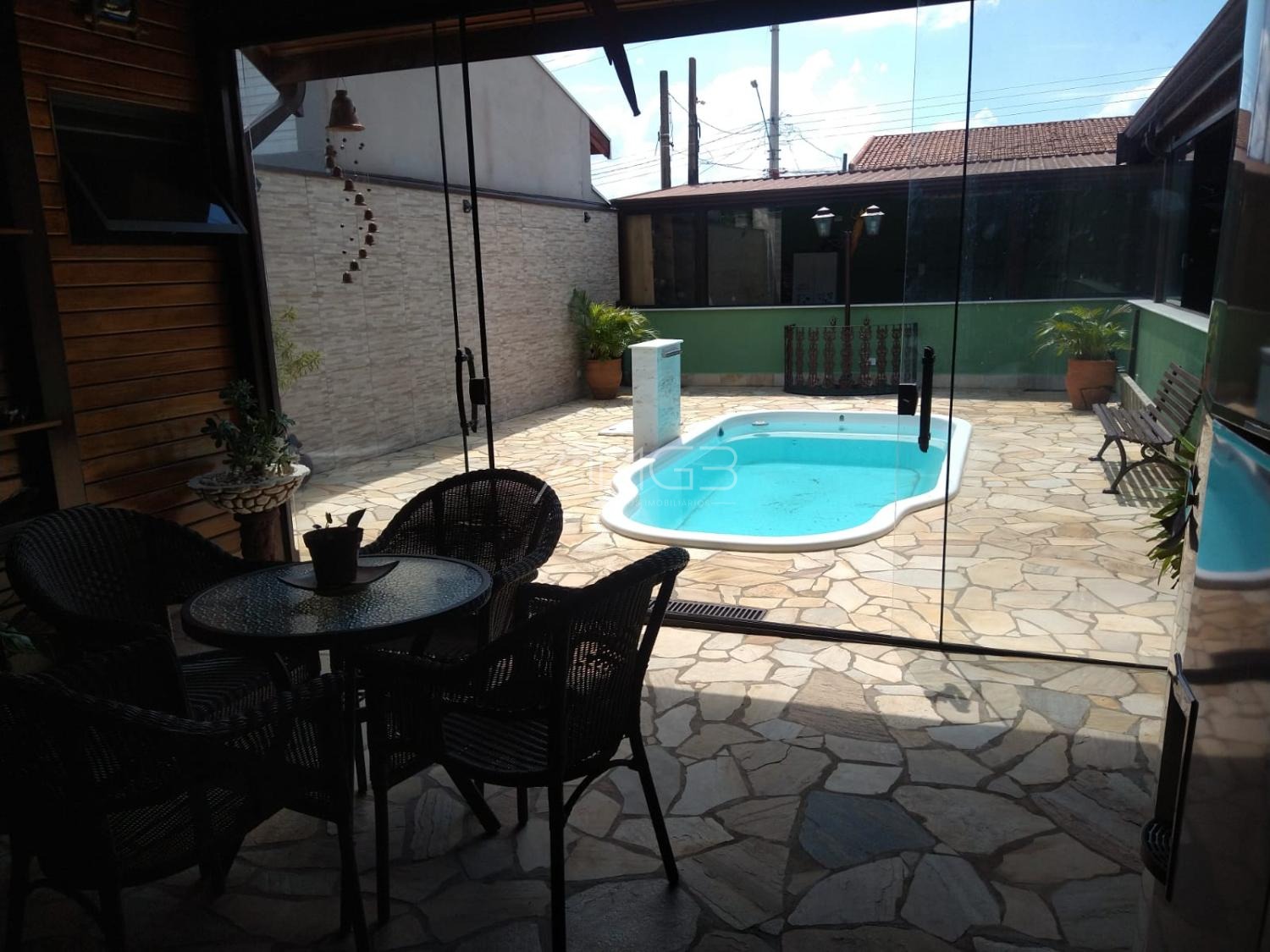 Na área externa, destaca-se a piscina, perfeita para os dias ensolarados, oferecendo um espaço agradável para relaxamento e entretenimento. A garagem coberta comporta até quatro veículos, garantindo segurança e proteção contra intempéries.