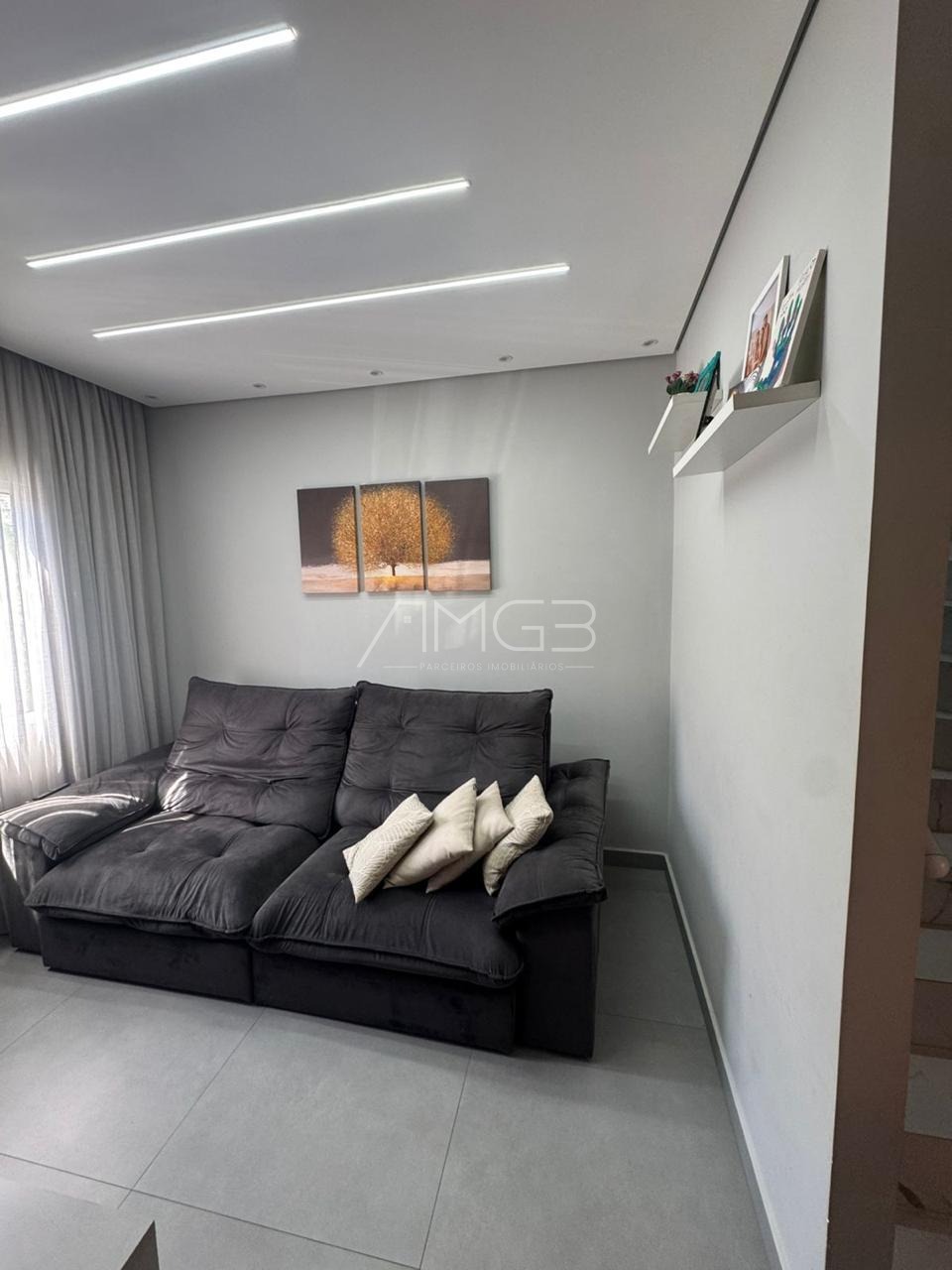 A casa conta com 3 dormitórios, sendo 1 suíte, além de banheiro social e lavabo. A sala é aconchegante e bem iluminada naturalmente, integrada a uma cozinha funcional que atende perfeitamente ao dia a dia.