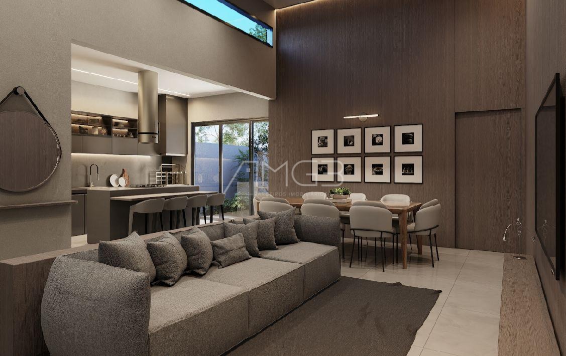 A residência conta com três suítes amplas, todas equipadas com ar-condicionado e marcenaria completa, além de escritório privativo, lavabo e despensa. A área social integra a cozinha ao espaço gourmet, proporcionando um ambiente versátil e acolhedor, ideal tanto para a rotina quanto para receber convidados.