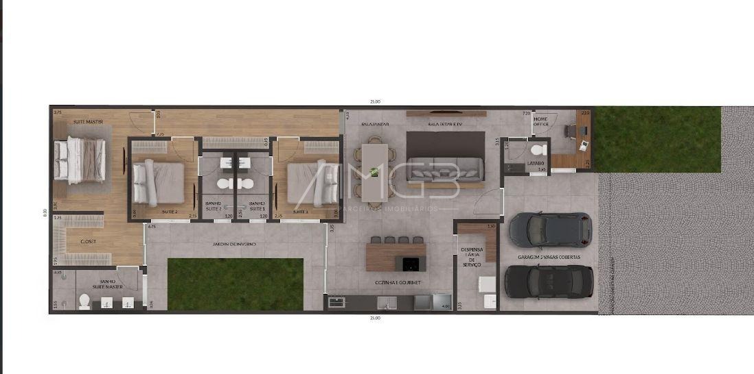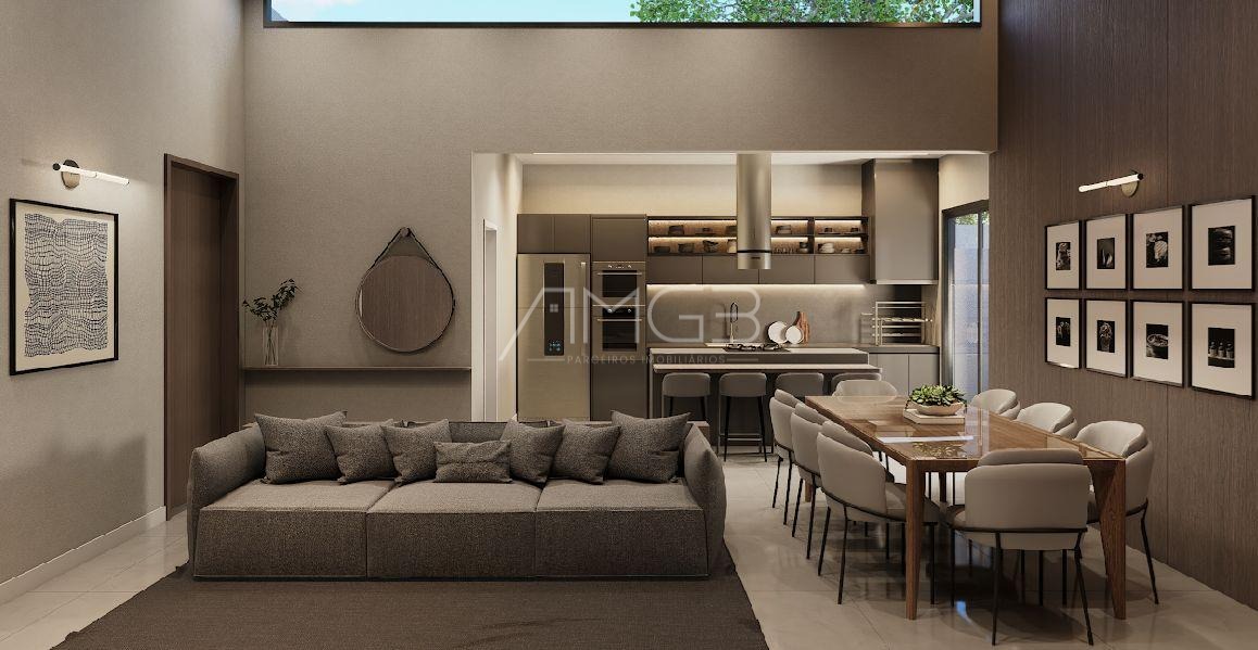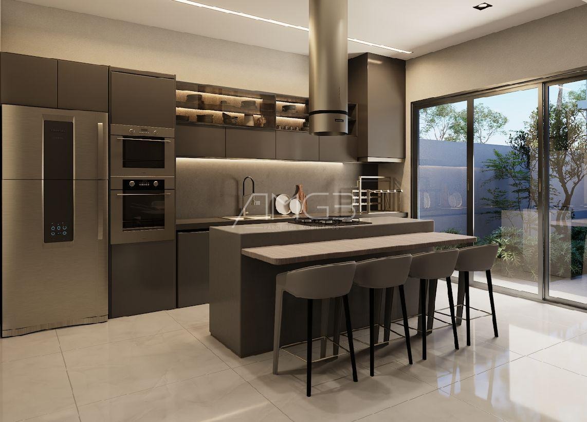 A residência conta com três suítes amplas, todas equipadas com ar-condicionado e marcenaria completa, além de escritório privativo, lavabo e despensa. A área social integra a cozinha ao espaço gourmet, proporcionando um ambiente versátil e acolhedor, ideal tanto para a rotina quanto para receber convidados.