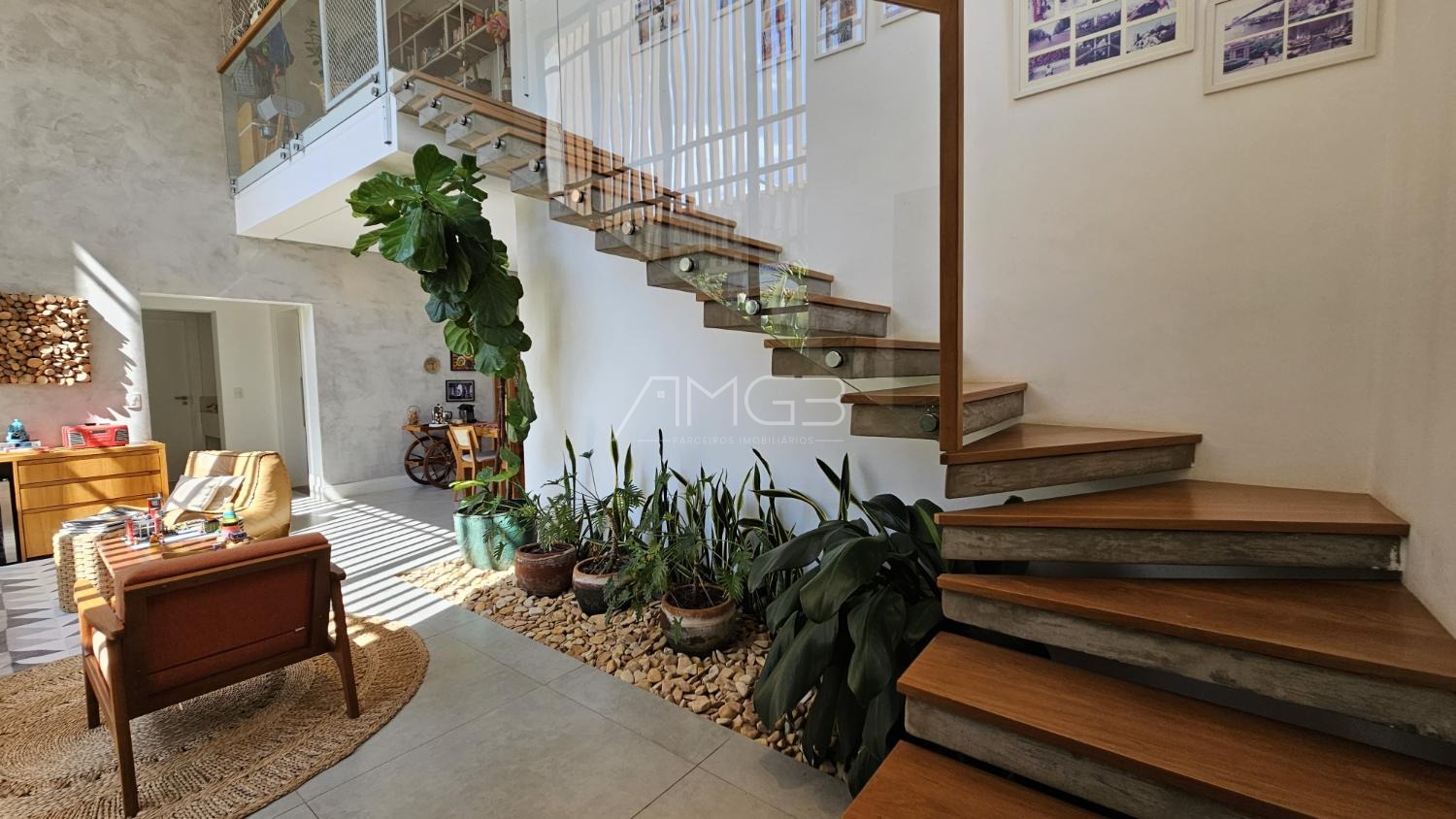 O piso térreo impressiona pelo pé-direito elevado e pela integração entre sala de estar, cozinha e espaço gourmet, criando um ambiente moderno e acolhedor — ideal para receber amigos e familiares. Conta ainda com lavabo de apoio.