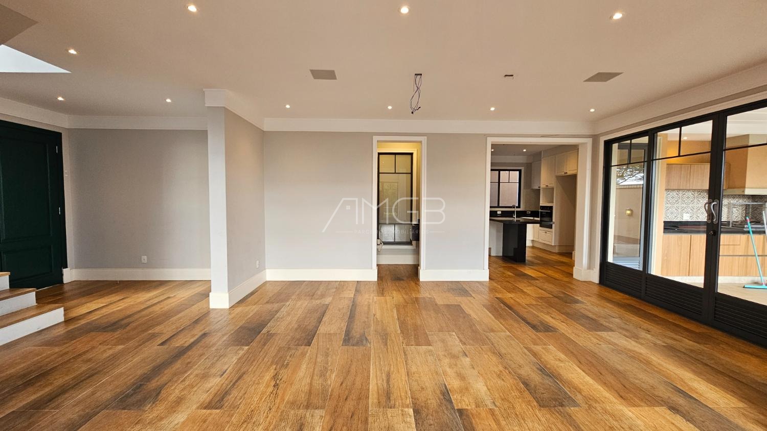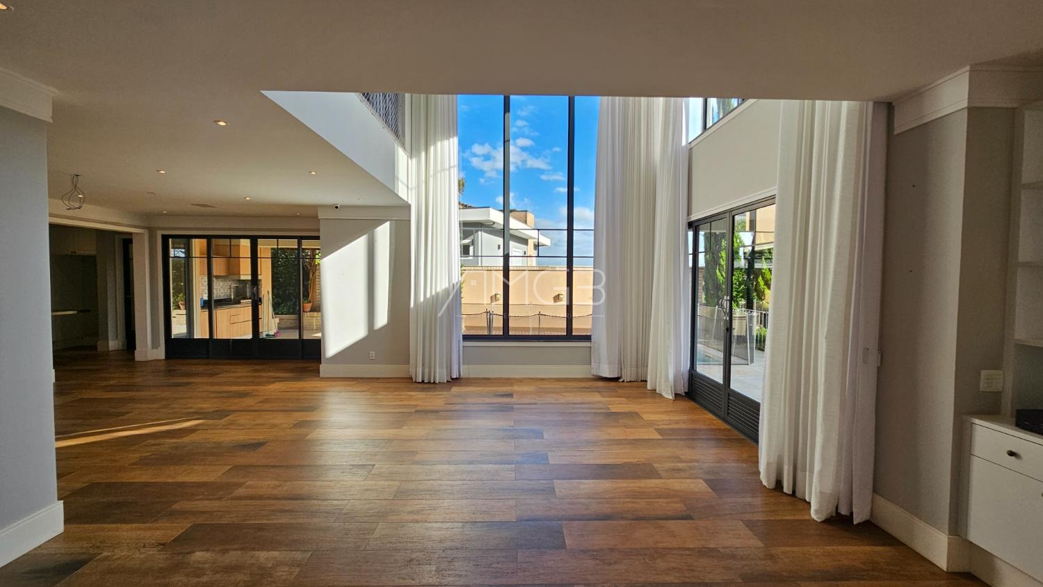 No pavimento térreo, o living com pé-direito duplo proporciona amplitude e sofisticação, permitindo integração entre diversos ambientes. A cozinha com ilha e despensa se conecta de forma funcional à área social, enquanto a área de serviço independente garante praticidade no dia a dia.