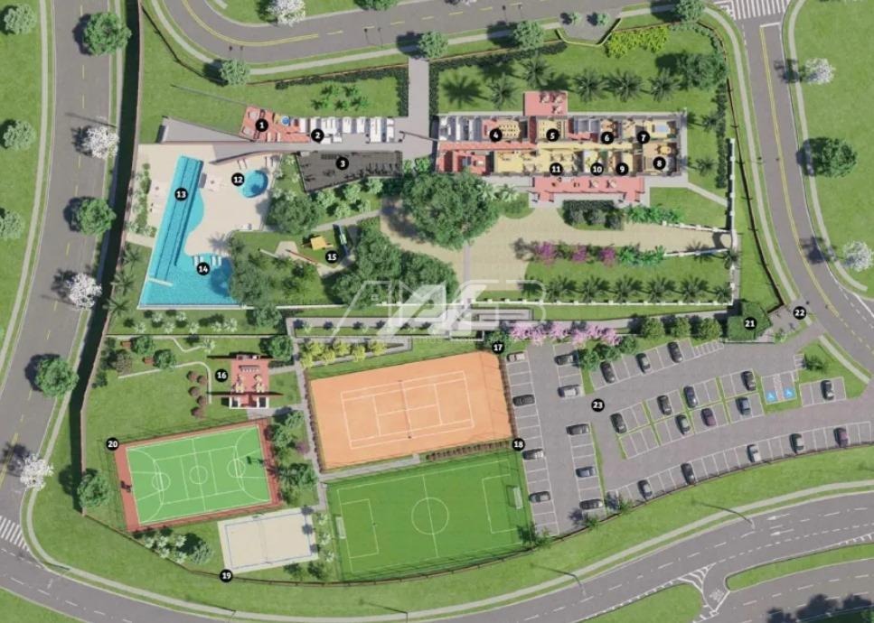 O condomínio oferece estrutura de lazer completa, incluindo quadra de tênis, quadra poliesportiva, espaço gourmet, sala de jogos, academia, área de leitura, piscina com prainha e playground infantil, proporcionando qualidade de vida e bem-estar para toda a família.